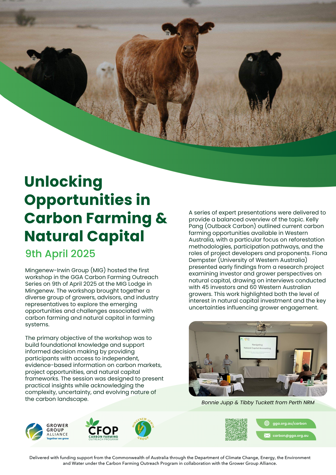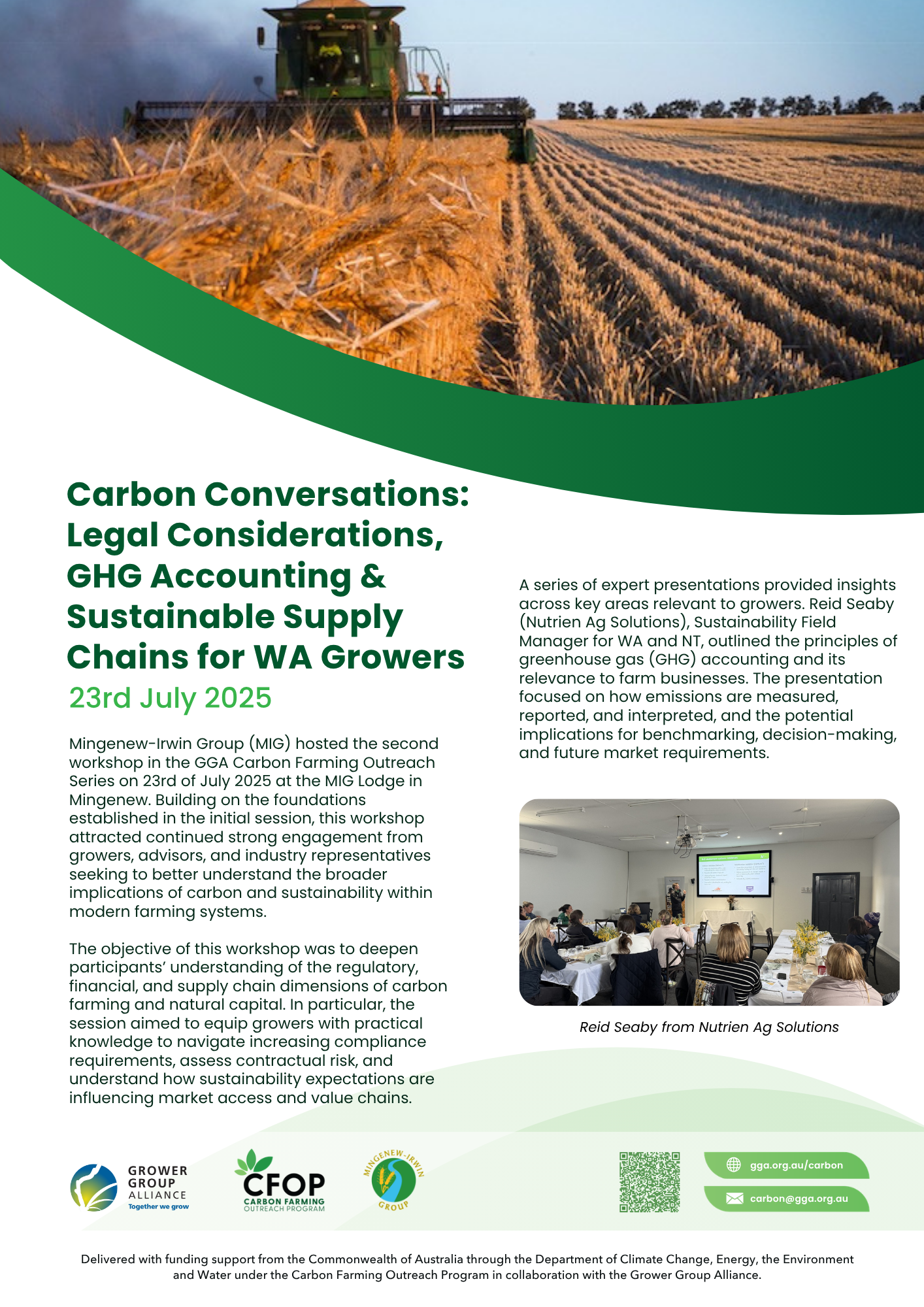 The Mingenew-Irwin Group (MIG) Carbon Farming Outreach workshops are part of a national, industry-led initiative delivered through the Grain Growers Association (GGA), aimed at improving grower understanding of carbon farming and natural capital. These workshops provide independent, evidence-based information to support informed decision-making, rather than promoting specific products or pathways. In a rapidly evolving space, MIG’s role is to facilitate access to credible information and create a platform for open discussion between growers, advisors, and industry experts.
